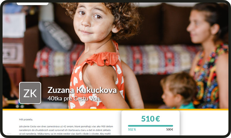 Vďaka vlastnej darcovskej výzve, ktorú si vytvoríte s vlastným textom a fotkou, môžete pomôcť zbierať dary pre vybranú organizáciu. Všetky príspevky idú priamo jej.